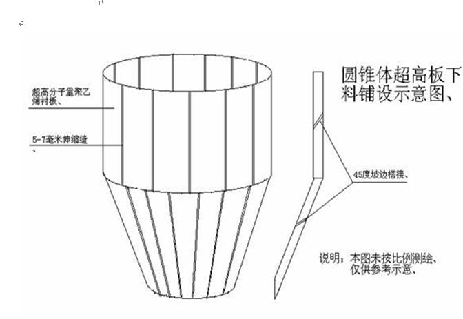 圓錐體;下料時(shí)其形狀為梯形、上寬數(shù)據(jù)=圓錐體上口周長(zhǎng)÷所需防粘耐磨襯板塊數(shù)。下寬數(shù)據(jù)=圓錐體下口周長(zhǎng)÷所需防粘耐磨襯板塊數(shù)。在倉(cāng)體內(nèi)鋪設(shè)防粘耐磨襯板時(shí),豎向縫隙應(yīng)留5-7毫米伸縮縫隙、橫向縫隙45度坡邊搭接。如圖所示;