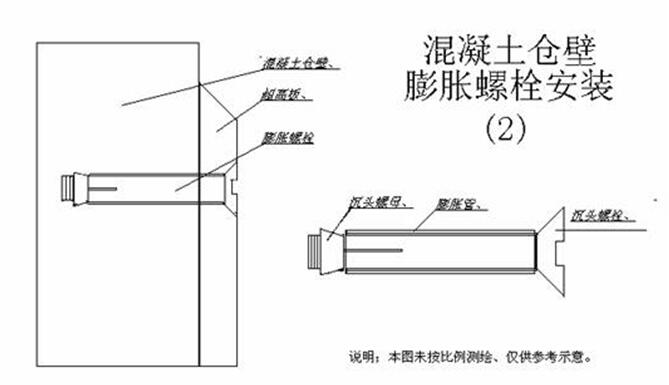 本安裝方法實(shí)用于混凝土煤倉(cāng)、料斗、地溝等。安裝時(shí)首先用射丁器、將防粘耐磨襯板固定在混凝土倉(cāng)壁上、然后、用電鉆將防粘耐磨襯板打通、再用電錘在混凝土壁上打合適深度 的洞眼、在防粘耐磨襯板上擴(kuò)、螺栓沉頭部分型壯的洞眼、然后、穿入膨脹螺栓、用內(nèi)六方扳手、旋轉(zhuǎn)沉頭螺栓、使內(nèi)端的沉頭螺母將膨脹管膨大旋緊為止。請(qǐng)參考