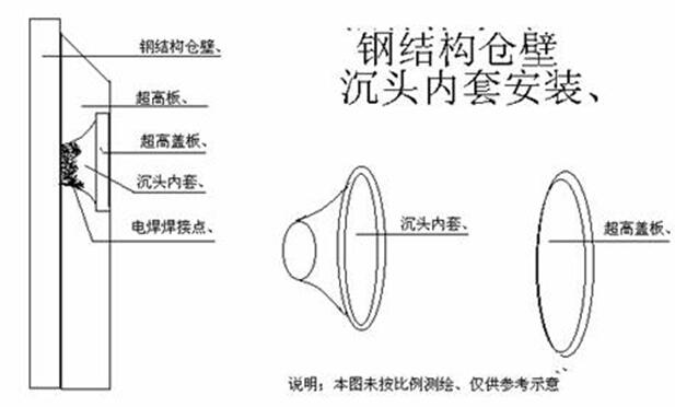 本安裝方法實(shí)用于鋼結(jié)構(gòu)煤倉(cāng)、料斗、溜槽等。安裝時(shí)首先用射釘器、將防粘耐磨襯板固定在鋼板上,然后、用電鉆將防粘耐磨襯板、鋼板一并打通、再在防粘耐磨襯板上擴(kuò)、螺栓沉頭部分型壯的洞眼,最后、穿入沉頭螺栓、從煤倉(cāng)外用平墊、簧墊、螺母旋緊為止。請(qǐng)參考